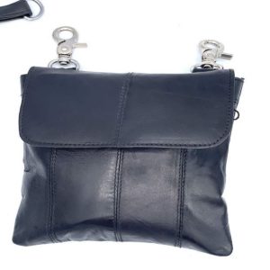 LEATHER BAG WITH LARGE HOOKS, DETACHABLE STRAP AND CELL PHONE POCKET. BELT LOOP AT BACK
