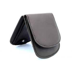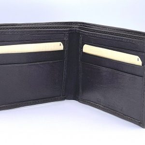 Leather tri-fold wallet with left flap up. Available in Black and brown