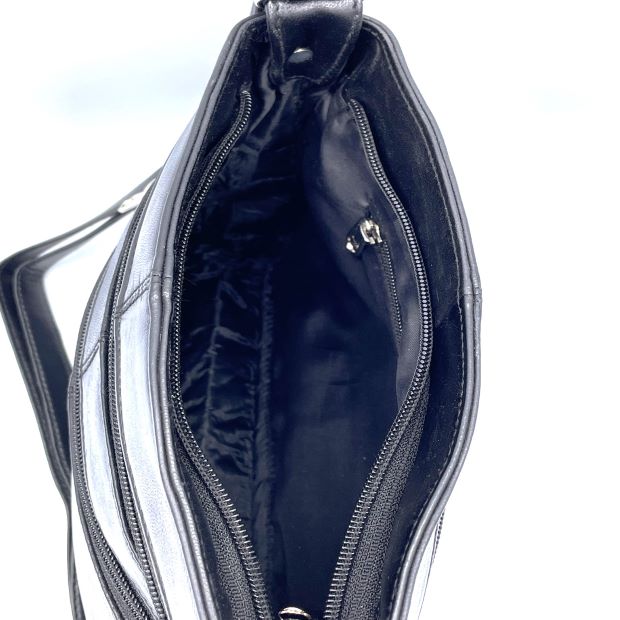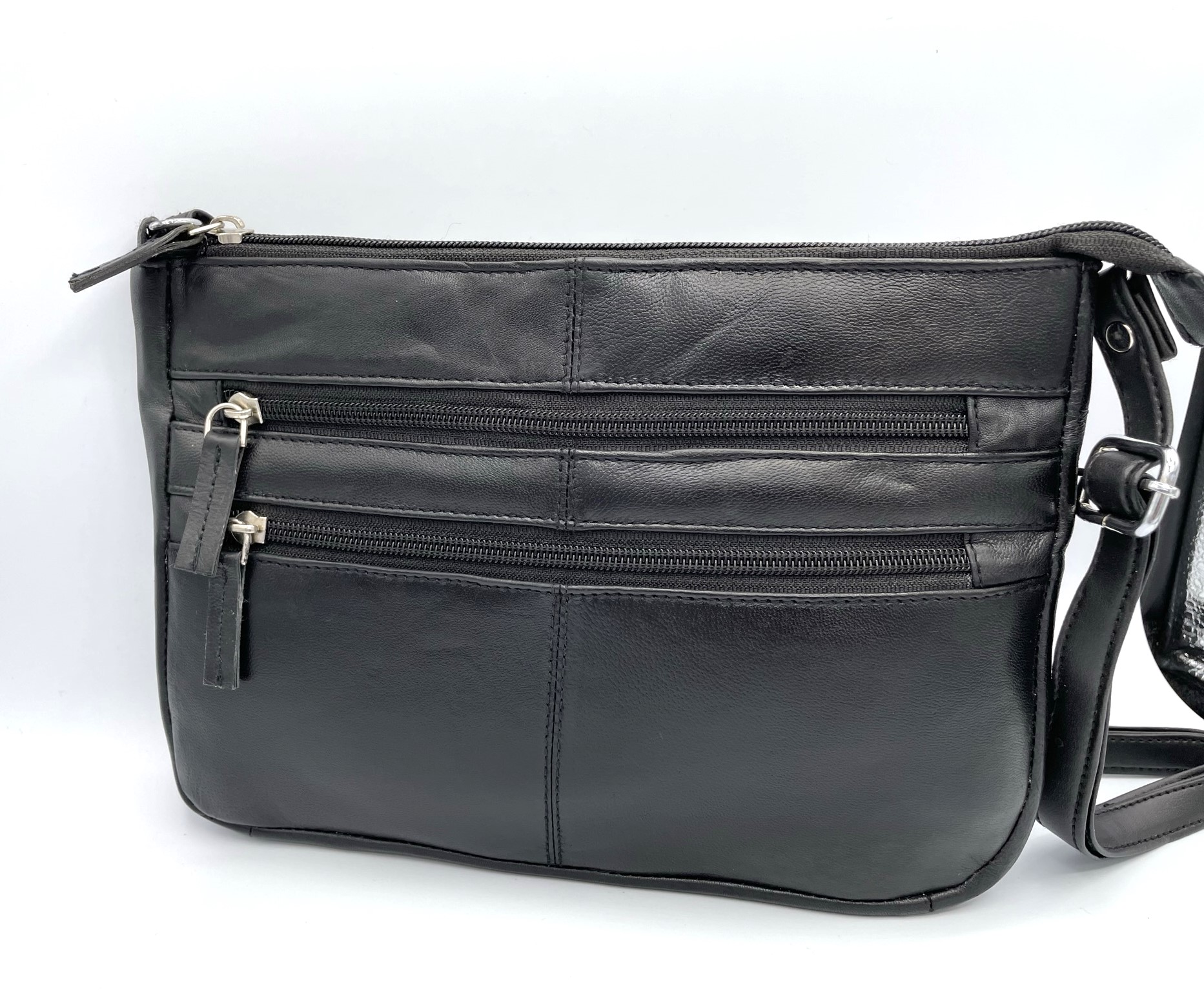SHEEP LEATHER HANDBAG WITH TOP ZIPPER COMPARTMENT, 2 FRONT ZIPPER COMPARTMENT AND BACK ZIPPER COMPARTMENT. Approx 10X7.5″