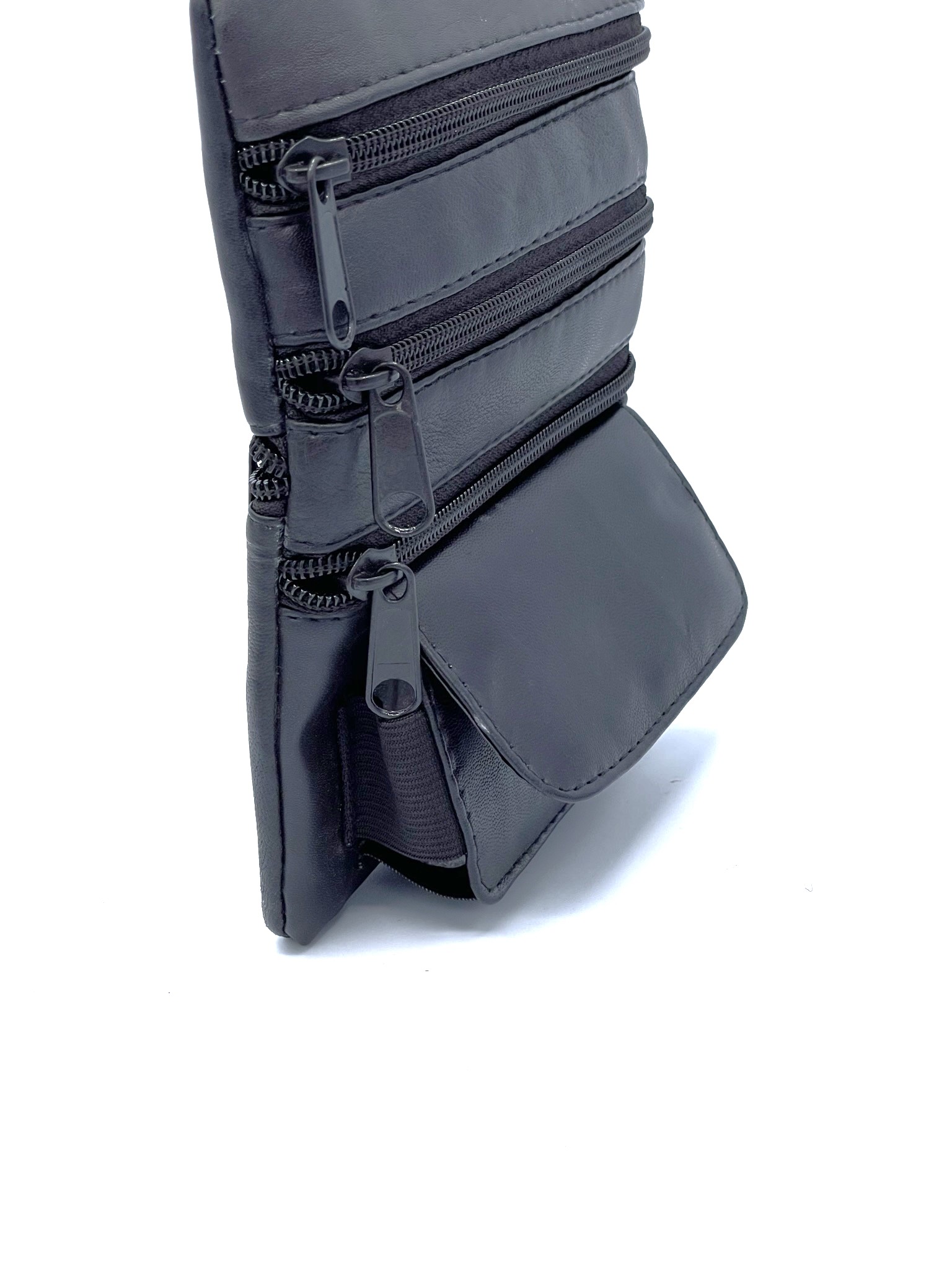 Leather bag with neck/shoulder strap with front cell phone pocket and front zipper compartments. Black and brown